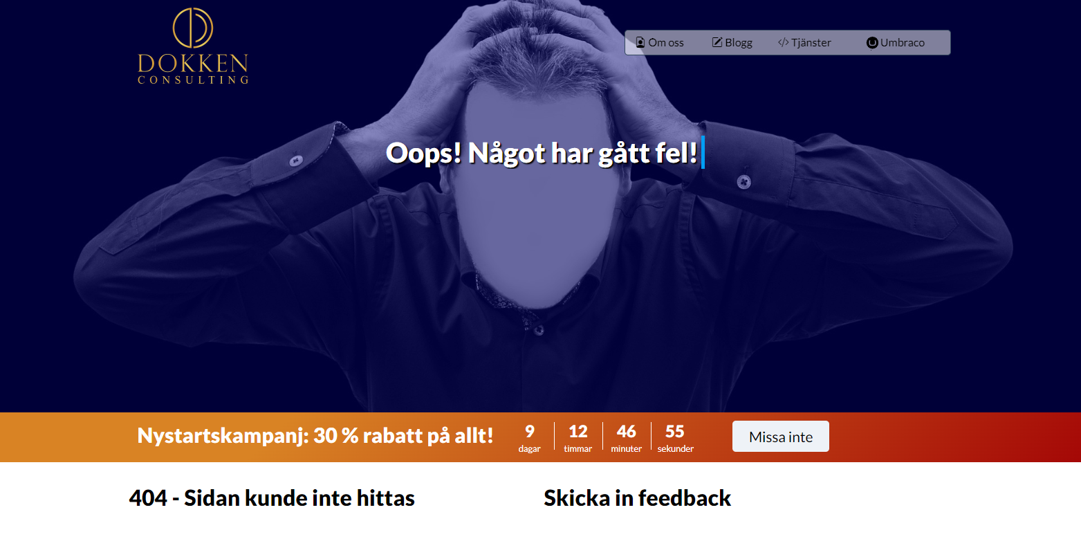 Så här ser vår 404-sida ut (öppnas i en ny flik) https://dokken.se/felsida123